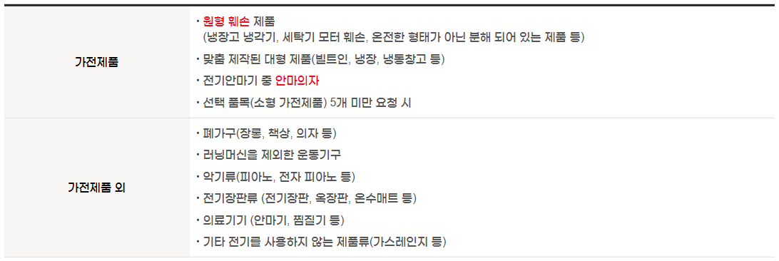 가전제품 중에서는 훼손된 제품은 수거 불가하고, 안마의자도 수거 불가능합니다. 또한 다량제출품목인 소형가전은 5개 미만일 때에는 수거가 불가능합니다.